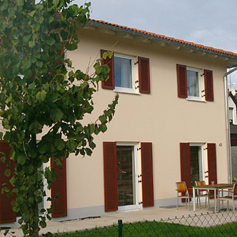 Auf einem nur 350 qm großem Grundstück wurde dieses kompakte Einfamilienhaus mit Walmdach gebaut.